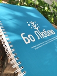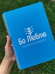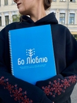 Блокнот "Бо люблю" А4 (210 × 297 мм). Доступний в блакитному кольорі. Серединка кремового кольору в клітинку. Блокнот скріплений металевою пружиною з лівого боку.